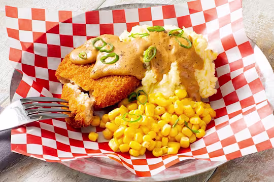 Recreate a true American classic at home with our Chicken-Fried Steak recipe! This meatless version of a classic Southern dish is prepared with a rich tahini gravy and served with creamy garlic mashed potatoes.