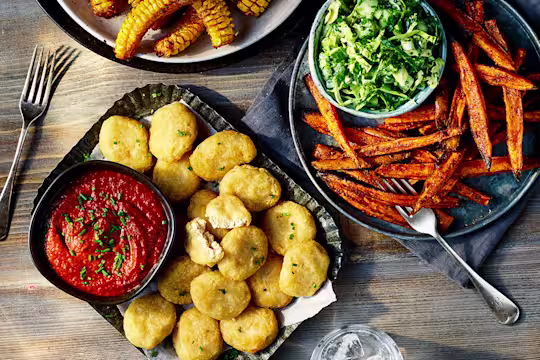 - Serve the slaw with the paprika sweet potato fries, corn ribs, Quorn Crispy Nuggets and BBQ dipping sauce.