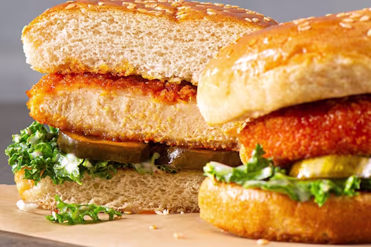 - Just before serving, toss patties with hot sauce. Assemble in buns with kale slaw and pickles.